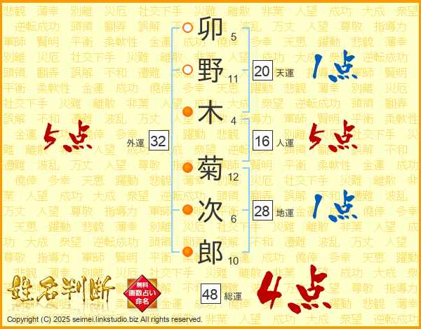 卯(5画)野(11画)木(4画) 菊(12画)次(6画)郎(10画)