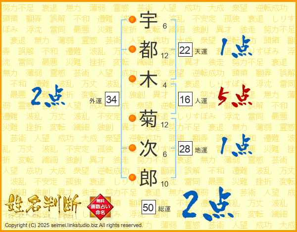 宇(6画)都(12画)木(4画) 菊(12画)次(6画)郎(10画)