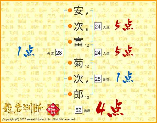 安(6画)次(6画)富(12画) 菊(12画)次(6画)郎(10画)