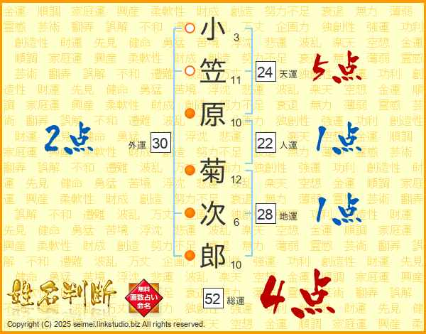 小笠原菊次郎さんの総運は52画の4点!