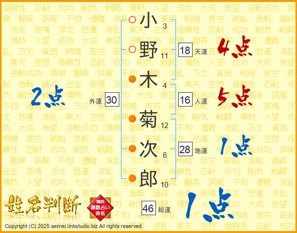 小(3画)野(11画)木(4画) 菊(12画)次(6画)郎(10画)