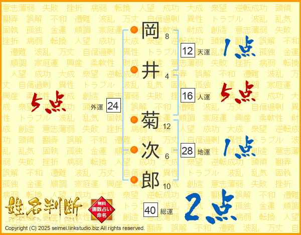 岡(8画)井(4画) 菊(12画)次(6画)郎(10画)