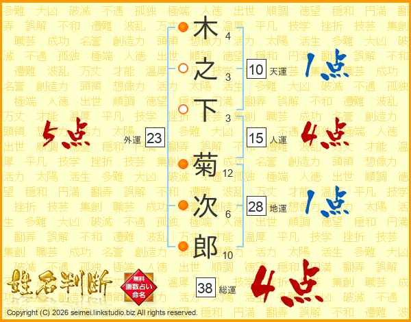 木(4画)之(3画)下(3画) 菊(12画)次(6画)郎(10画)