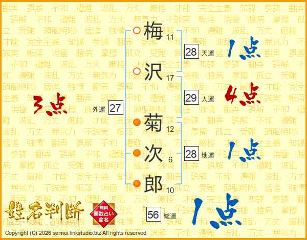 梅(11画)沢(17画) 菊(12画)次(6画)郎(10画)