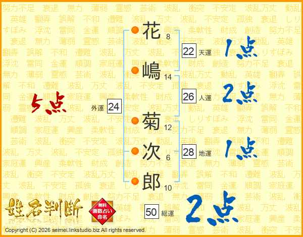 花(8画)嶋(14画) 菊(12画)次(6画)郎(10画)