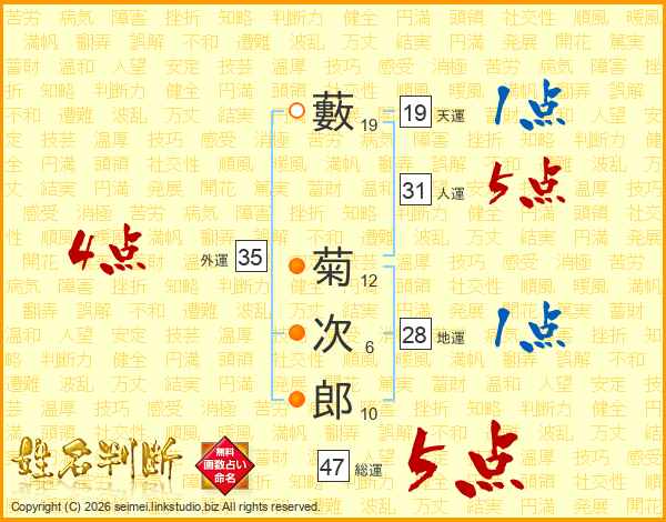 藪(19画) 菊(12画)次(6画)郎(10画)