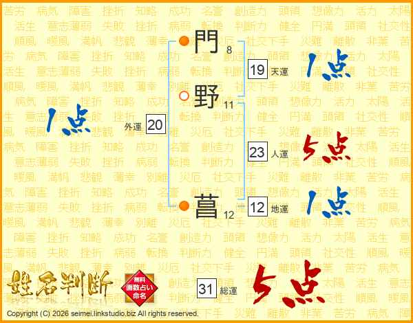生活面を象徴する運勢です。外部から受ける影響力を表し、結婚運、家庭運や職場、環境への順応性を表します。総運から人運を引いた画数。姓や名が1文字の場合を除く。