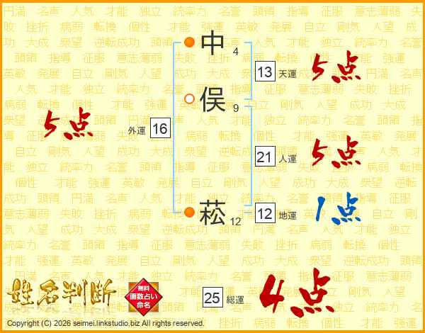 生活面を象徴する運勢です。外部から受ける影響力を表し、結婚運、家庭運や職場、環境への順応性を表します。総運から人運を引いた画数。姓や名が1文字の場合を除く。