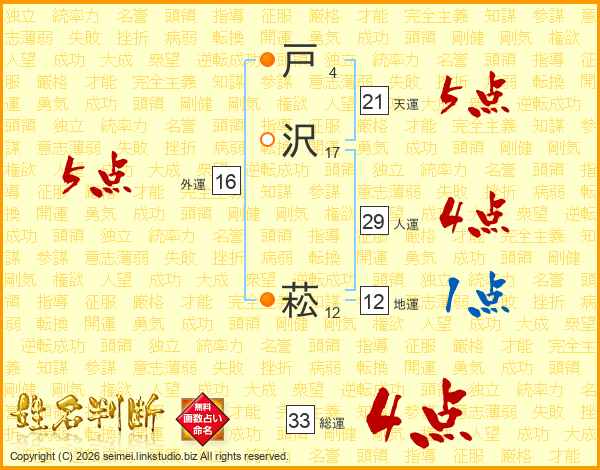 あなたの人生を表す1番重要な運勢です。生涯を通じて影響する総合運となり、主に50歳以降の晩年期に影響を及ぼします。苗字と名前の合計画数。