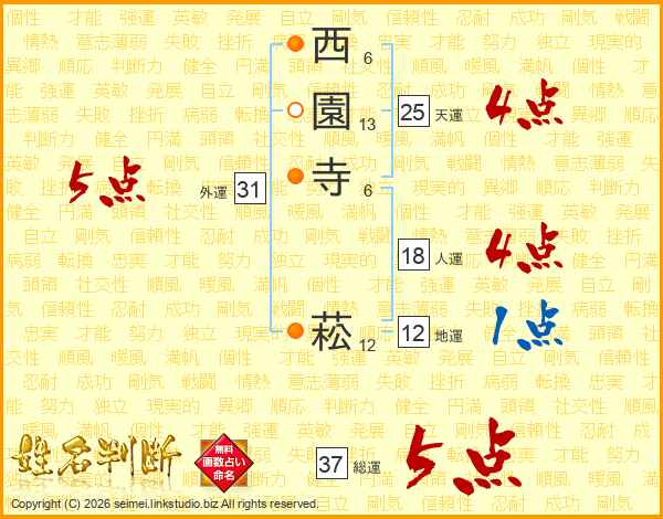 西園寺菘さんの総運は37画の5点!