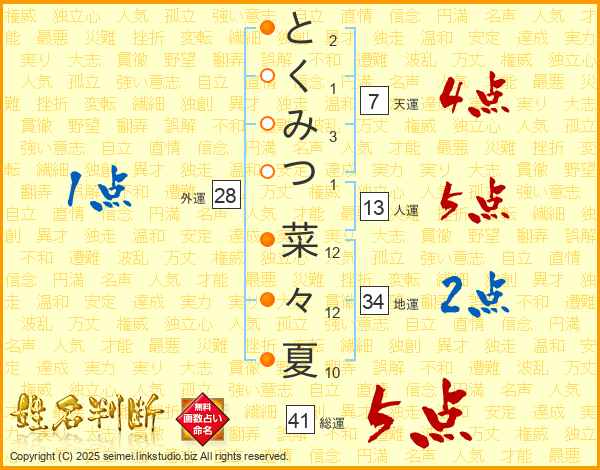 と(2画)く(1画)み(3画)つ(1画) 菜(12画)々(12画)夏(10画)