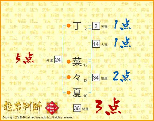 生活面を象徴する運勢です。外部から受ける影響力を表し、結婚運、家庭運や職場、環境への順応性を表します。総運から人運を引いた画数。姓や名が1文字の場合を除く。