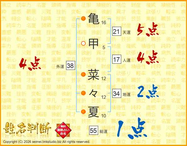 亀甲菜々夏さんの外運は38画の4点!