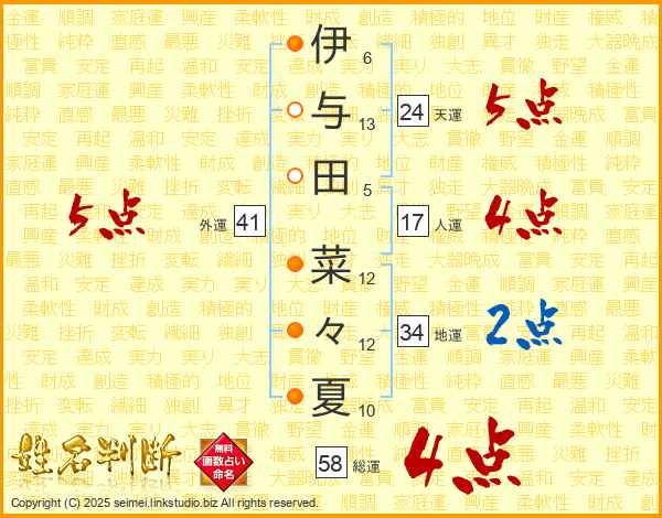 伊(6画)与(13画)田(5画) 菜(12画)々(12画)夏(10画)
