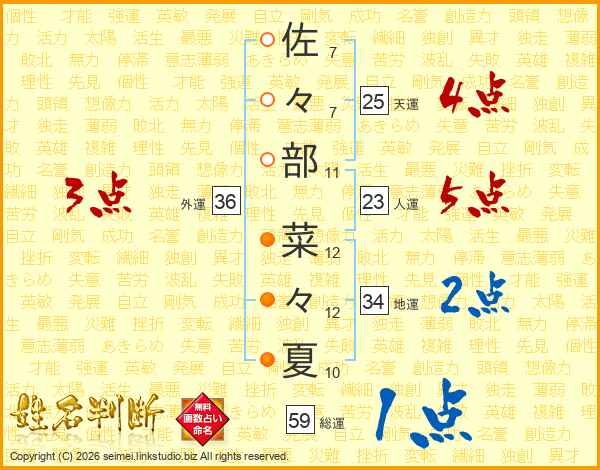 佐(7画)々(7画)部(11画) 菜(12画)々(12画)夏(10画)