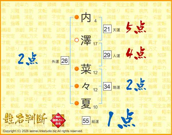 内(4画)澤(17画) 菜(12画)々(12画)夏(10画)
