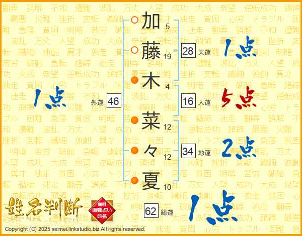 加(5画)藤(19画)木(4画) 菜(12画)々(12画)夏(10画)