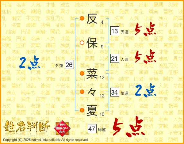 生活面を象徴する運勢です。外部から受ける影響力を表し、結婚運、家庭運や職場、環境への順応性を表します。総運から人運を引いた画数。姓や名が1文字の場合を除く。