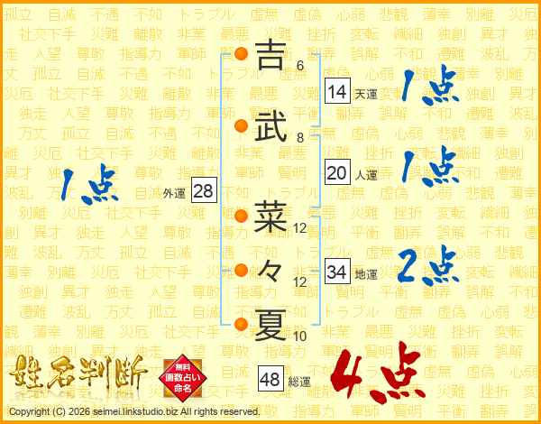 吉(6画)武(8画) 菜(12画)々(12画)夏(10画)