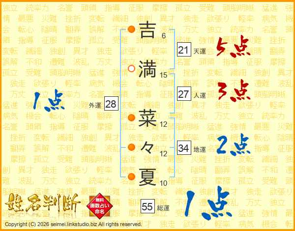 吉(6画)満(15画) 菜(12画)々(12画)夏(10画)