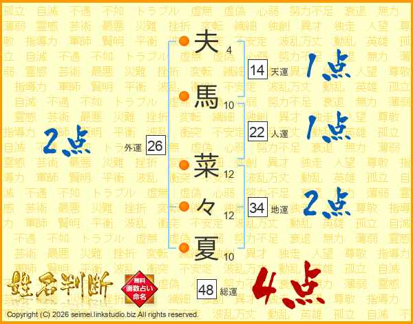 生活面を象徴する運勢です。外部から受ける影響力を表し、結婚運、家庭運や職場、環境への順応性を表します。総運から人運を引いた画数。姓や名が1文字の場合を除く。