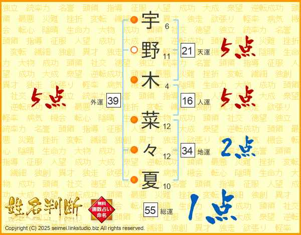 宇(6画)野(11画)木(4画) 菜(12画)々(12画)夏(10画)
