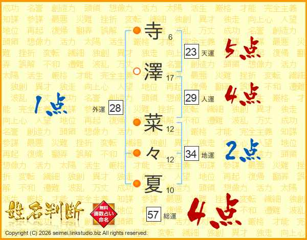 寺(6画)澤(17画) 菜(12画)々(12画)夏(10画)