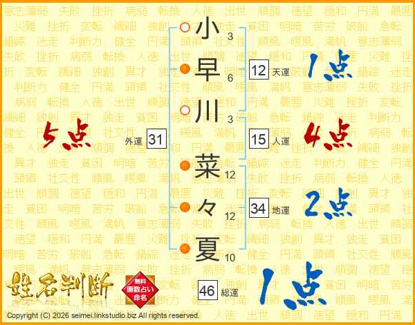 小(3画)早(6画)川(3画) 菜(12画)々(12画)夏(10画)