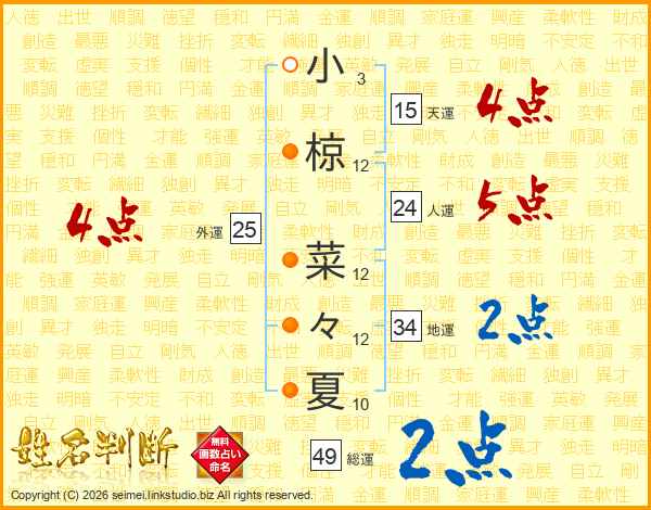 小(3画)椋(12画) 菜(12画)々(12画)夏(10画)