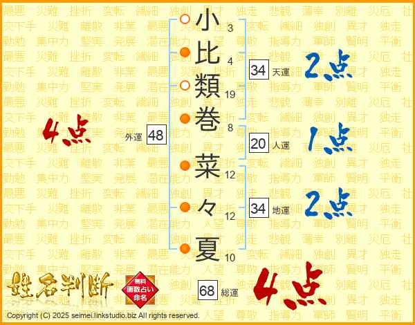 小比類巻菜々夏さんの総運は68画の4点!