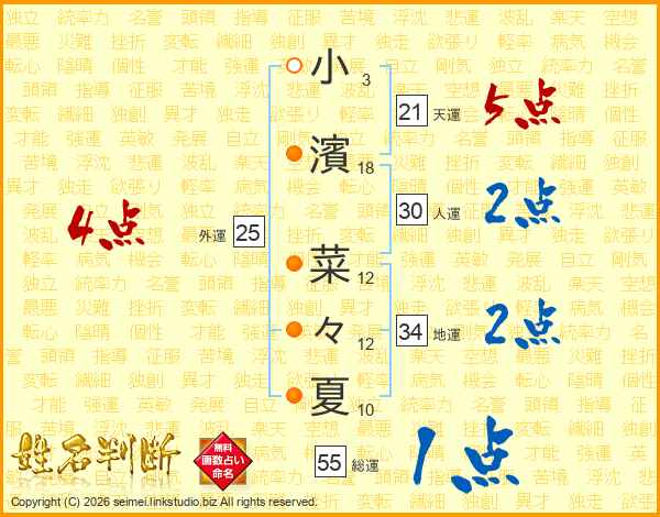 小(3画)濱(18画) 菜(12画)々(12画)夏(10画)