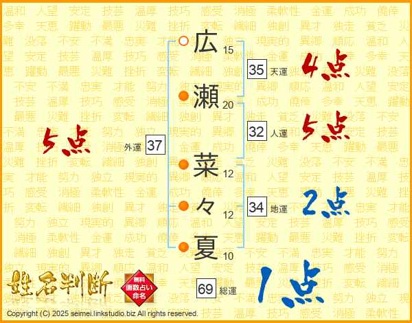 広(15画)瀬(20画) 菜(12画)々(12画)夏(10画)