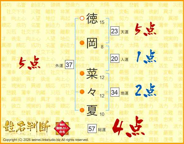 徳(15画)岡(8画) 菜(12画)々(12画)夏(10画)