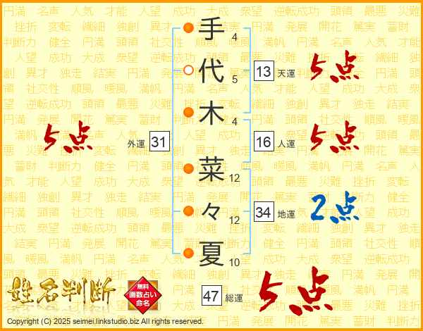 手(4画)代(5画)木(4画) 菜(12画)々(12画)夏(10画)