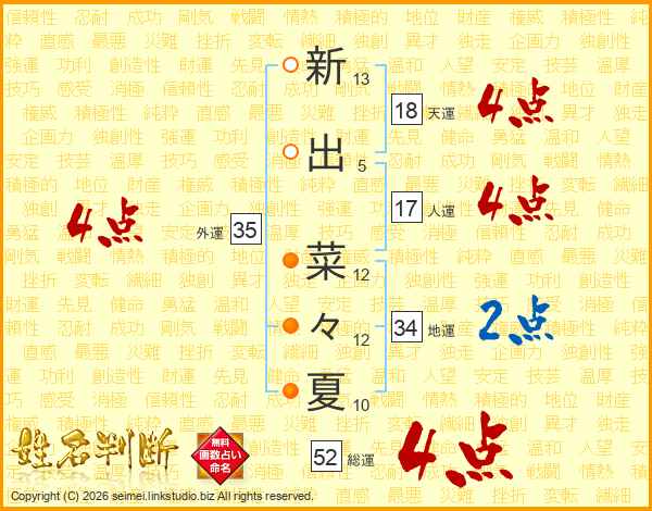 新(13画)出(5画) 菜(12画)々(12画)夏(10画)