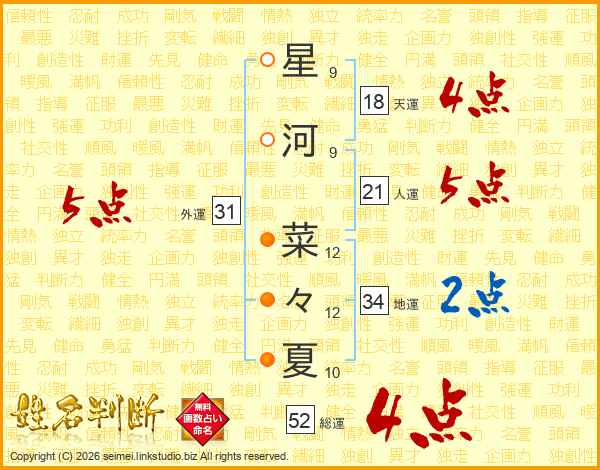 星(9画)河(9画) 菜(12画)々(12画)夏(10画)