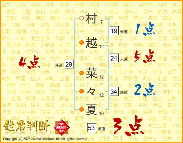 村(7画)越(12画) 菜(12画)々(12画)夏(10画)