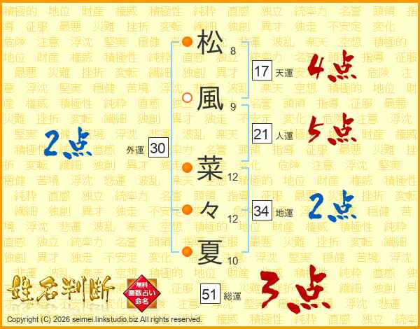 松(8画)風(9画) 菜(12画)々(12画)夏(10画)