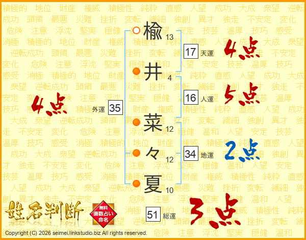 楡(13画)井(4画) 菜(12画)々(12画)夏(10画)