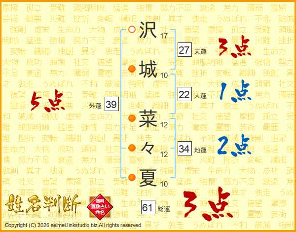 沢(17画)城(10画) 菜(12画)々(12画)夏(10画)