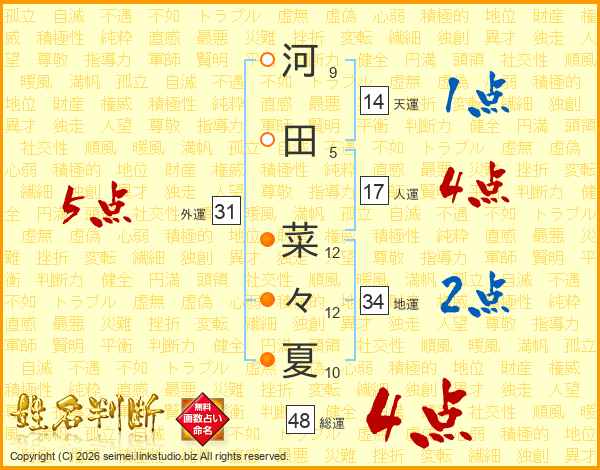 河(9画)田(5画) 菜(12画)々(12画)夏(10画)