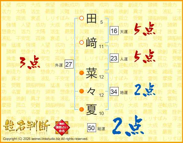 田(5画)﨑(11画) 菜(12画)々(12画)夏(10画)