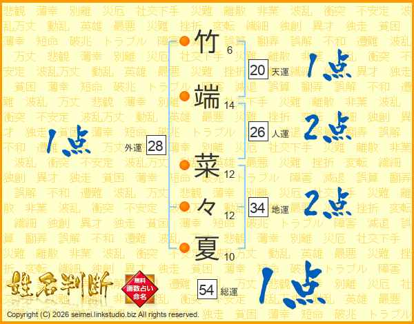 生活面を象徴する運勢です。外部から受ける影響力を表し、結婚運、家庭運や職場、環境への順応性を表します。総運から人運を引いた画数。姓や名が1文字の場合を除く。