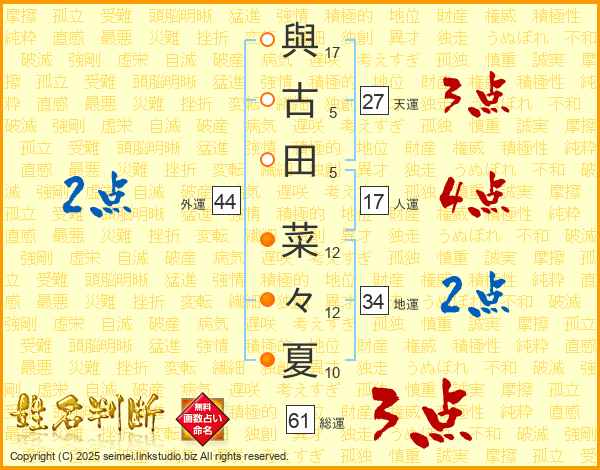 與(17画)古(5画)田(5画) 菜(12画)々(12画)夏(10画)