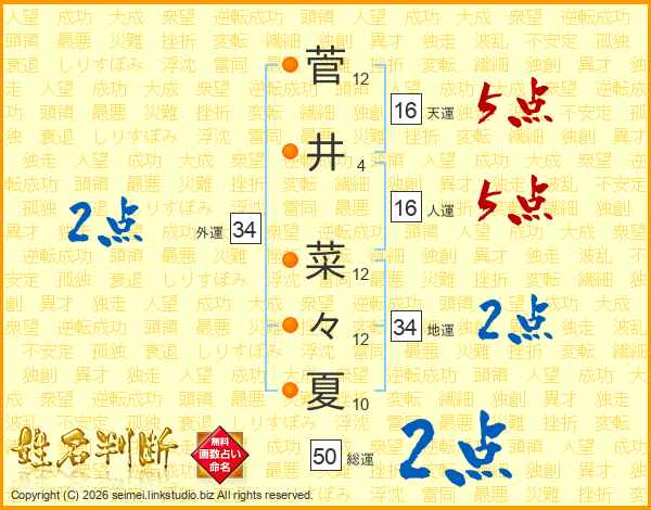 菅(12画)井(4画) 菜(12画)々(12画)夏(10画)