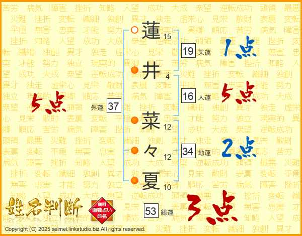 蓮(15画)井(4画) 菜(12画)々(12画)夏(10画)