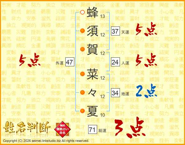 蜂(13画)須(12画)賀(12画) 菜(12画)々(12画)夏(10画)
