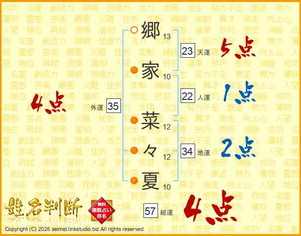 郷(13画)家(10画) 菜(12画)々(12画)夏(10画)