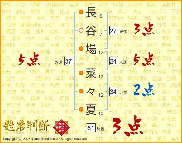 長(8画)谷(7画)場(12画) 菜(12画)々(12画)夏(10画)