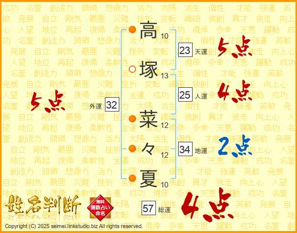 高(10画)塚(13画) 菜(12画)々(12画)夏(10画)